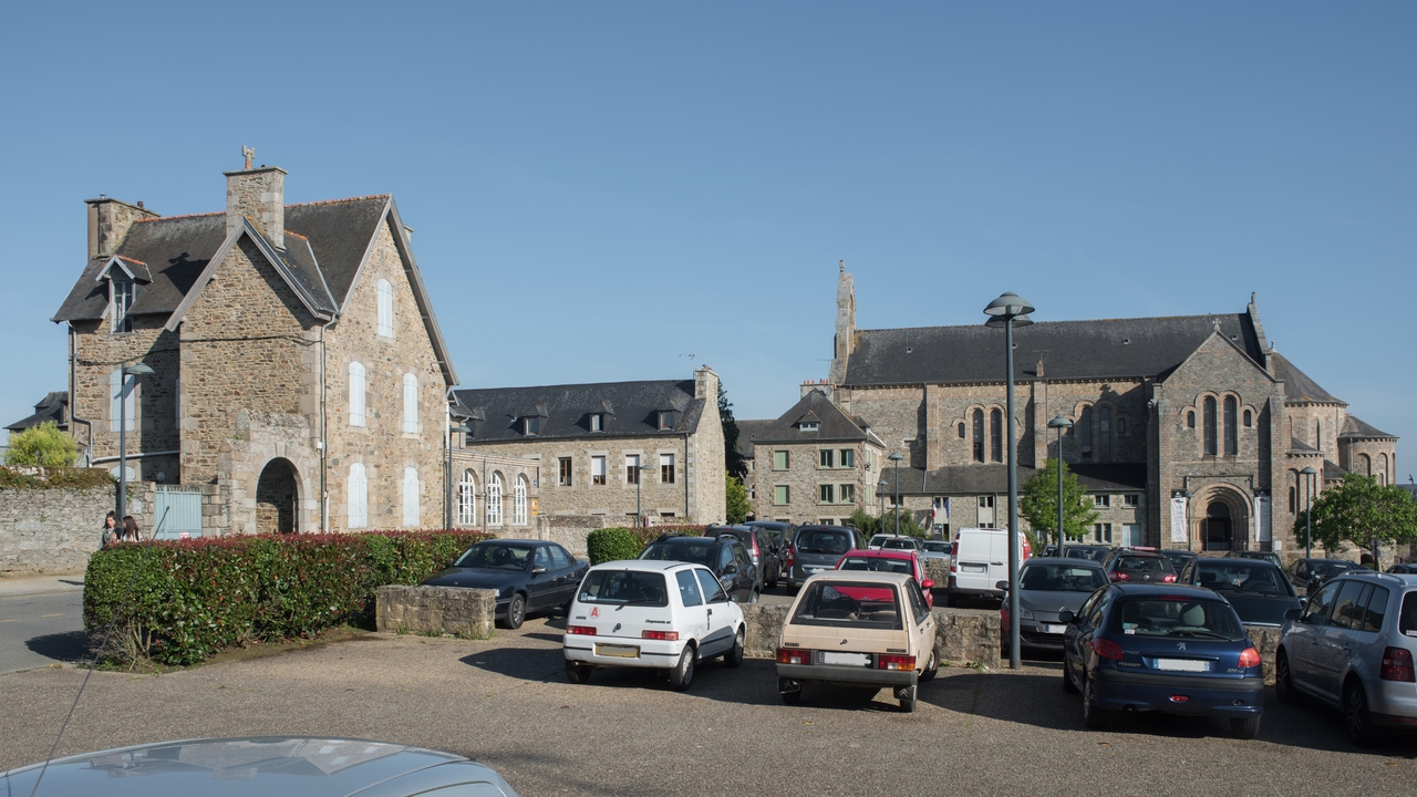 Tréguier, place de la République : maison d'habitation et bureaux de l'Inscription maritime, vue de situation. En arrière-plan à droite, la chapelle du Collège ecclésiastique de Tréguier aujourd'hui Théâtre de l'ArcheImmatriculation