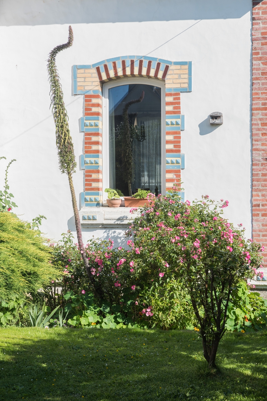 Façade sud. Détail d'une fenêtre en brique vernissée et émailléeImmatriculation