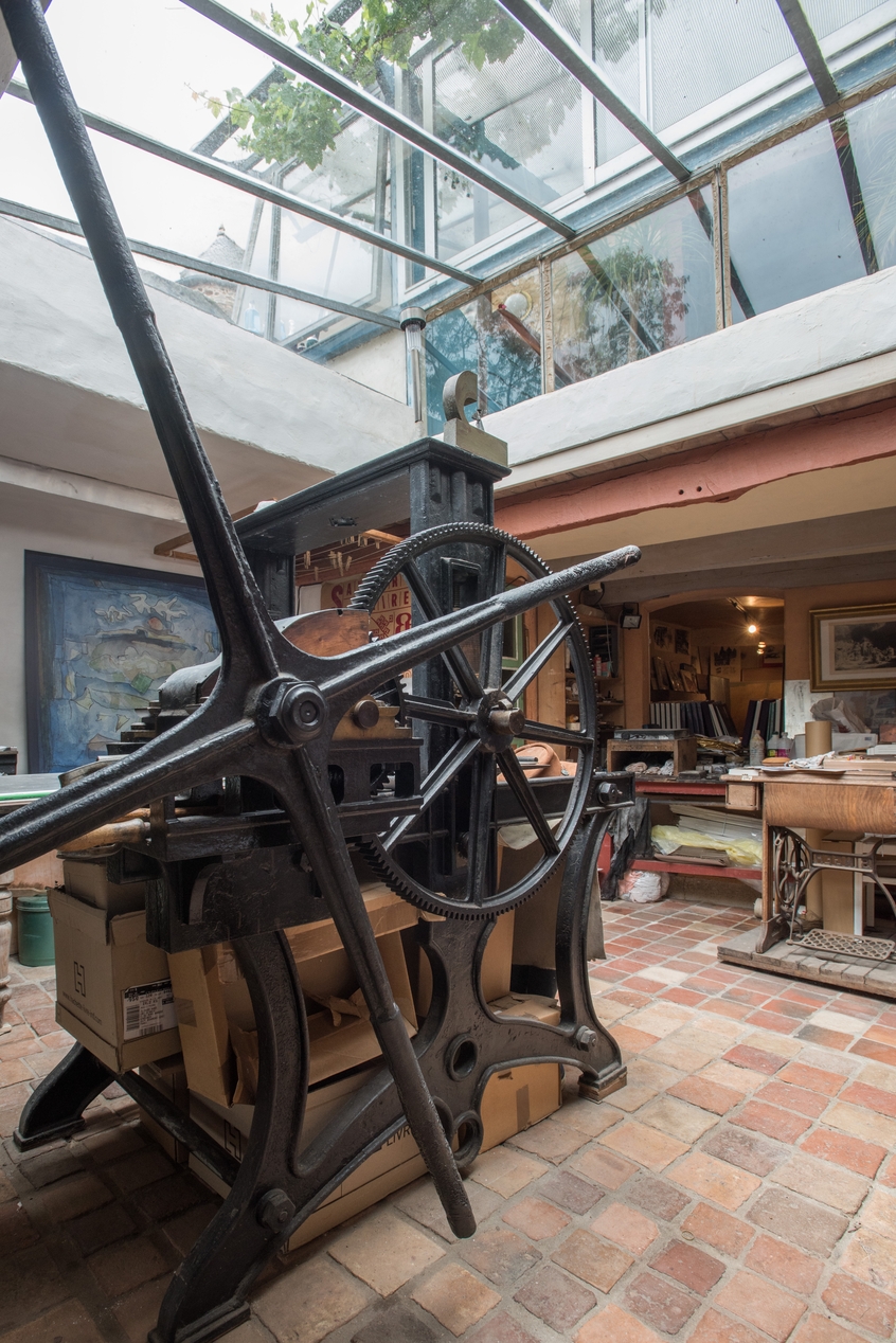 Atelier construit à l'arrière de la maison. Presse typographique. Vue généraleImmatriculation