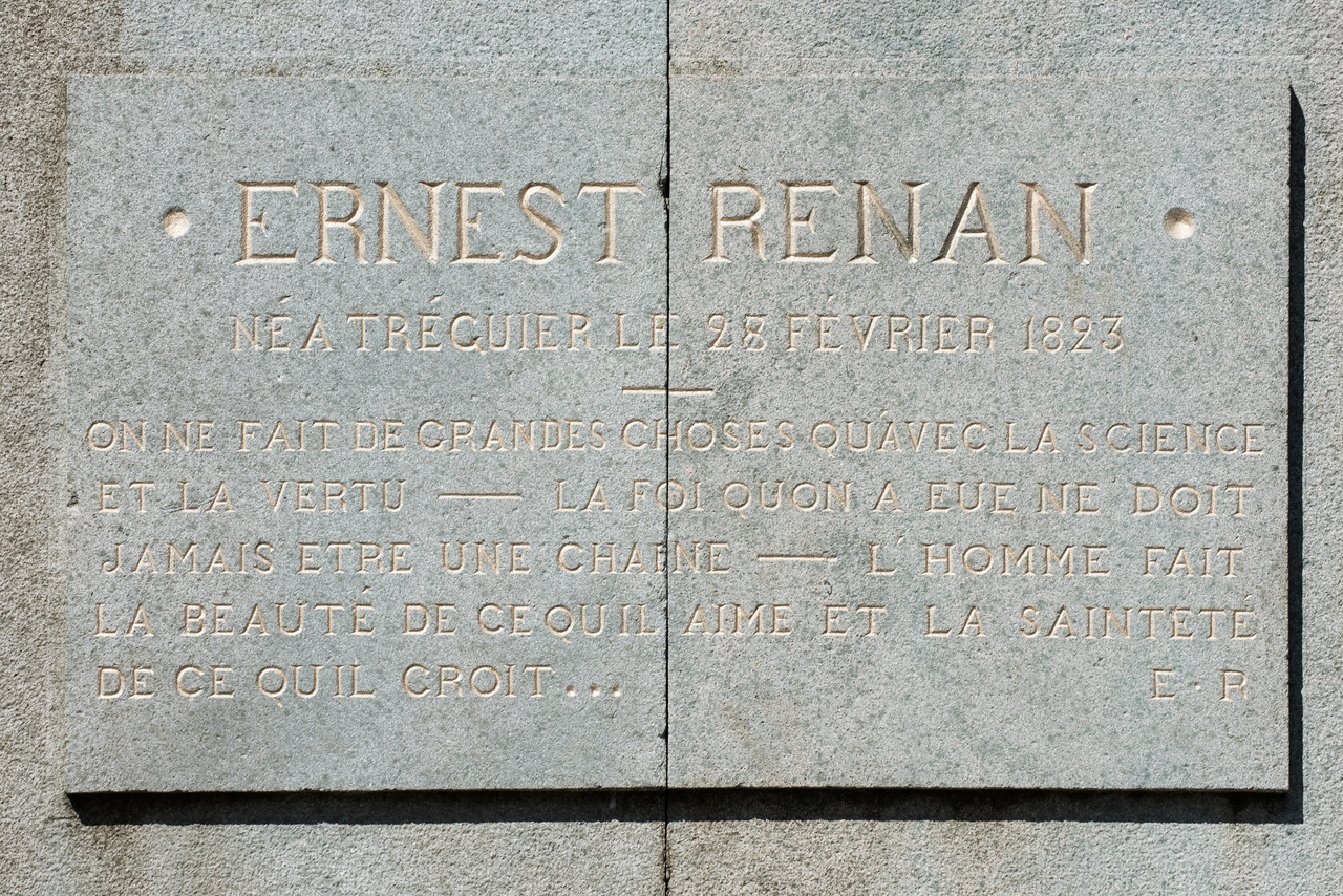 Tréguier, place du Martray : Tréguier, place du Martray : statue d'Ernest Renan et de la déesse Pallas Athéna, détail de la plaque commémorative. Sur la plaque, on peut lire : "Ernest Renan / né à Tréguier le 28 février 1823 / On ne fait de grandes choses qu'avec la science / et la vertu - la foi qu'on a eue ne doit / jamais être une chaîne - l'homme fait / la beauté de ce qu'il aime et la sainteté / de ce qu'il croit... / E. R."Immatriculation