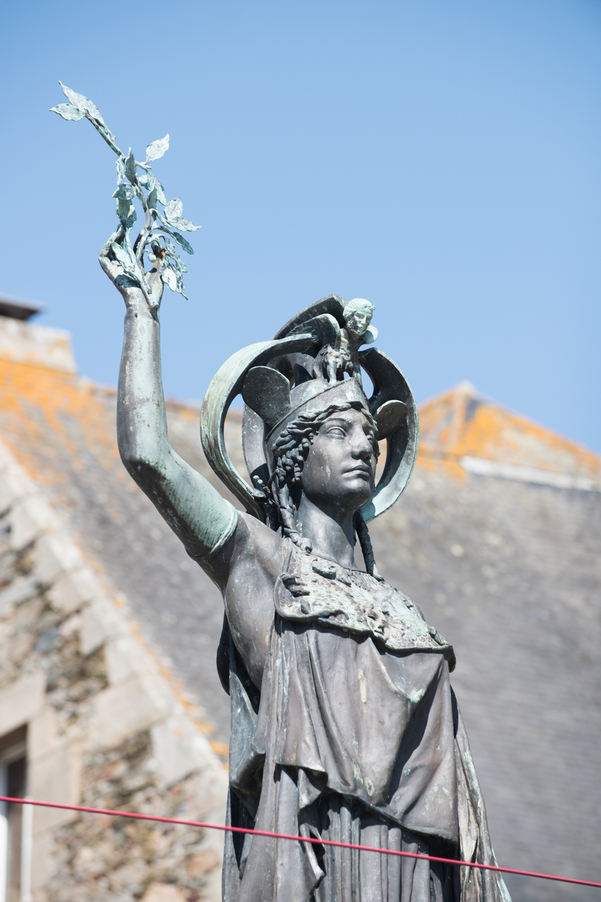 Tréguier, place du Martray : statue d'Ernest Renan et de la déesse Pallas Athéna, détail de la déesse AthénaImmatriculation