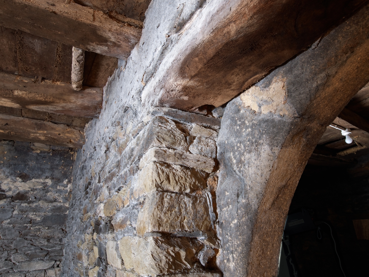 Sous-sol. Large porte ouverte dans le mur de refend. Détail du linteau arrière : trou ménagé sous le linteau pour le pivot d'un vantailImmatriculation