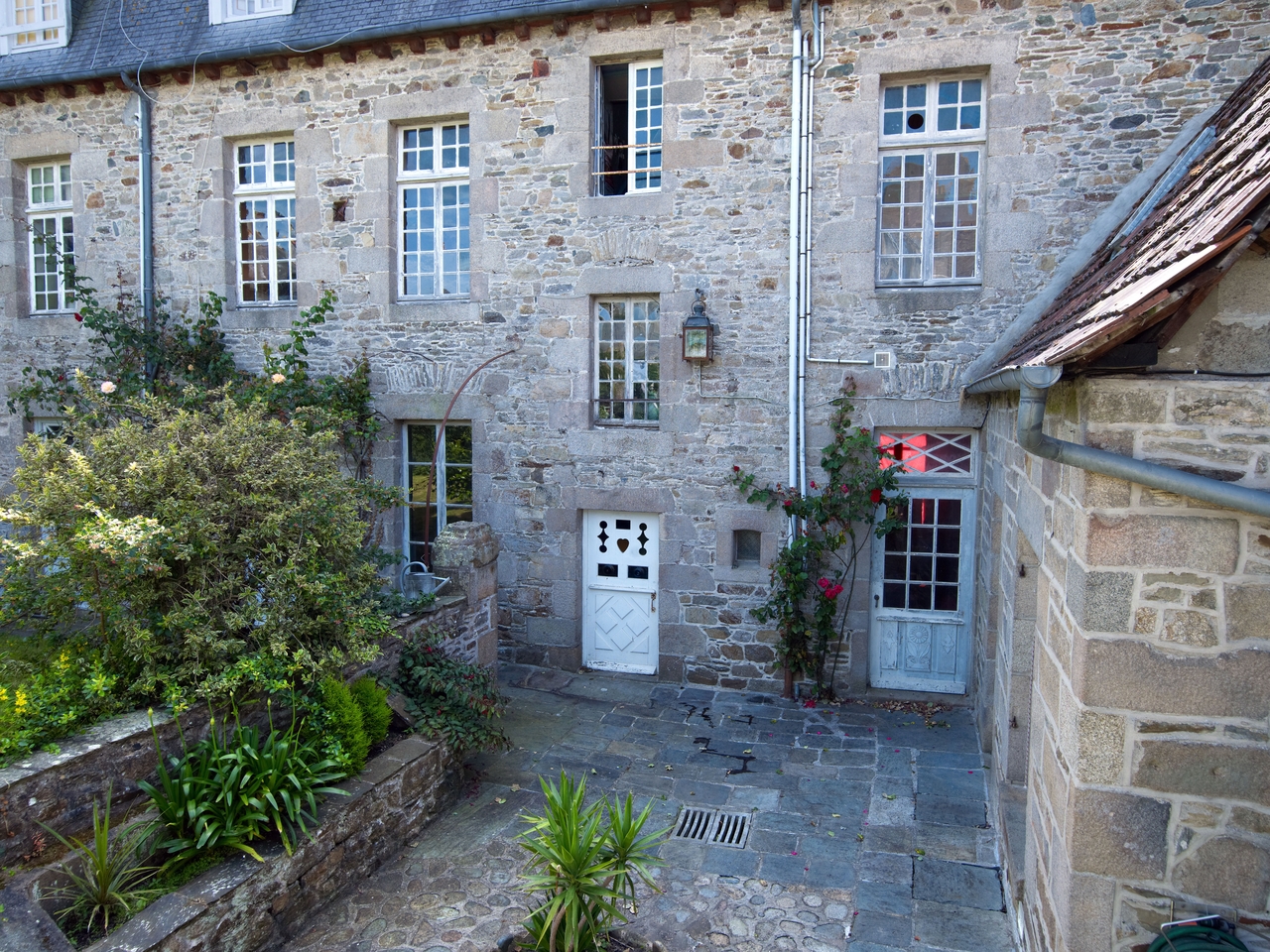 Façade est et cour pavée sur laquelle ouvrent les portes du vestibule et de la cuisine.Immatriculation