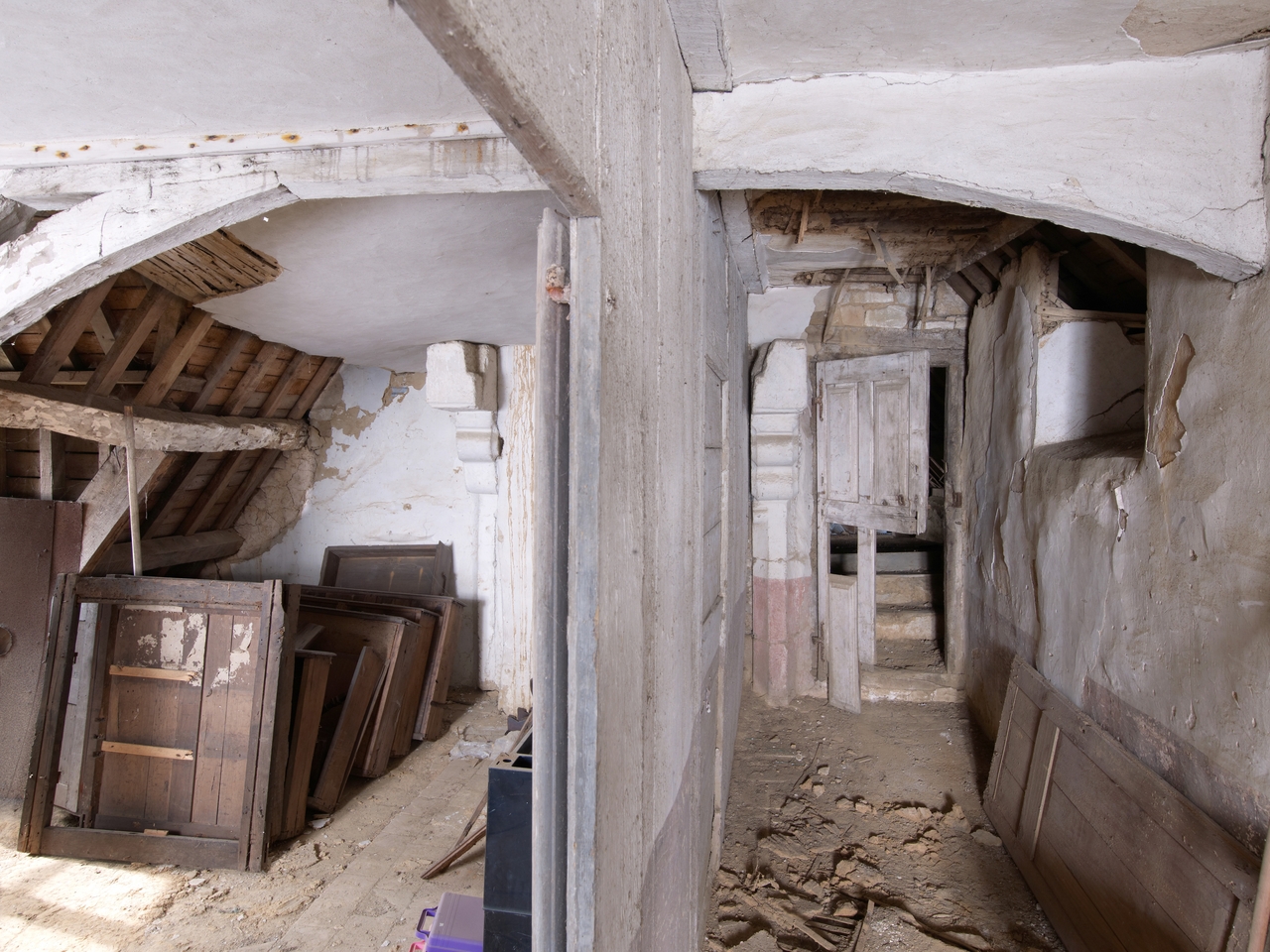Tréguier, boulevard Anatole Le Braz : palais épiscopal aujourd'hui mairie et bibliothèque, aile sud-est, étage de comble, vestiges d'une cheminée médiévale (?). Au premier plan, une cloison postérieure en bois. Percée dans le pignon, la porte permet l'accès à étage de comble de la sacristieImmatriculation