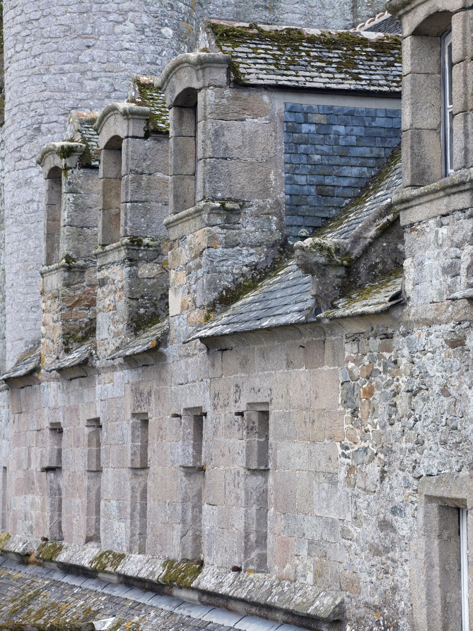 Tréguier : sacristie de la cathédrale Saint-Tugdual et aile sud-est du palais épiscopal, élévation est côté cloître. L'étage de comble a été doté par la suite de lucarnes (linteaux en arc segmentaire)Immatriculation