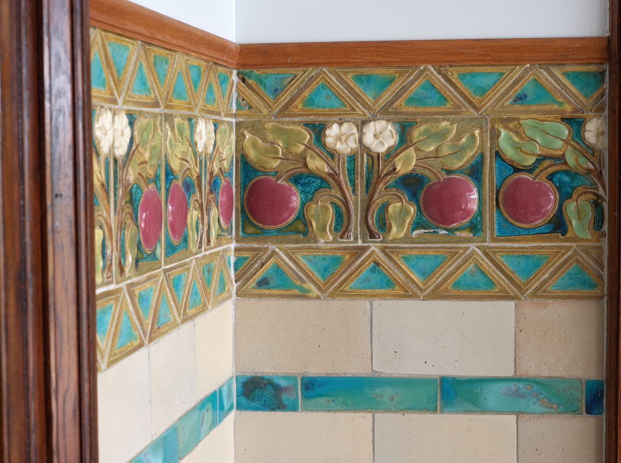 Jardin d'hiver. Détail d'un pan de mur en céramique de grès avec décor en relief de fleurs de cerisiers et de cerisesImmatriculation