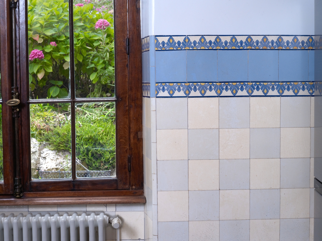 Cuisine. Détail d'un pan de mur habillé de carreaux de faïenceImmatriculation