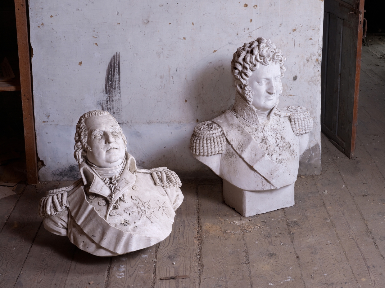 Tréguier, boulevard Anatole Le Braz : palais épiscopal aujourd'hui mairie et bibliothèque, aile sud-ouest, étage de comble, détail des bustes (à gauche : Louis XVIII, à droite : Louis-Philippe 1er)Immatriculation