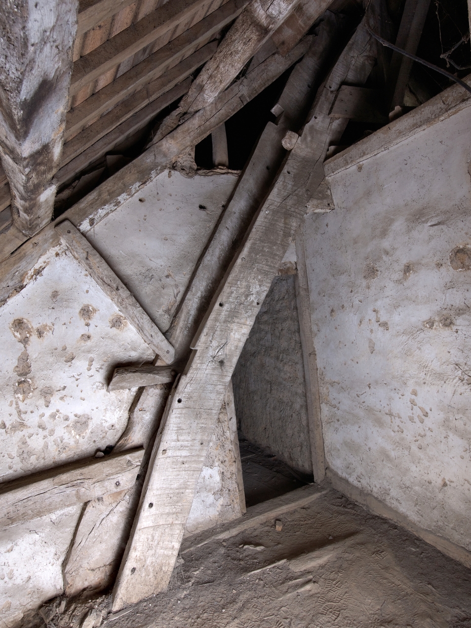 Tréguier, boulevard Anatole Le Braz : palais épiscopal aujourd'hui mairie et bibliothèque, aile sud-est, étage de comble, détail du chemisage du bâtiment et de la modification de la charpenteImmatriculation