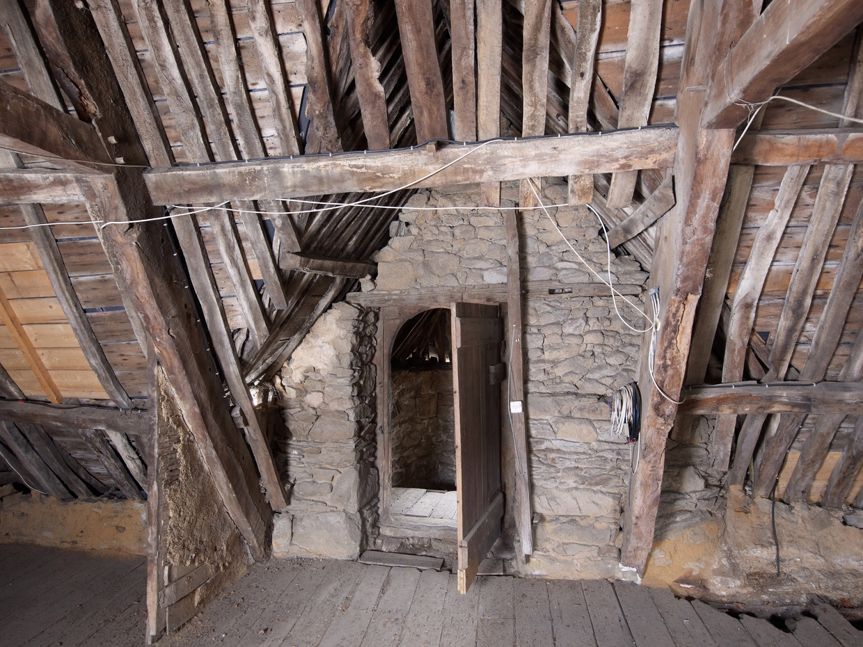Tréguier, 26 rue Colvestre : maison à pan de bois, porte en arc plein cintre en bois donnant à l'étage de combleImmatriculation