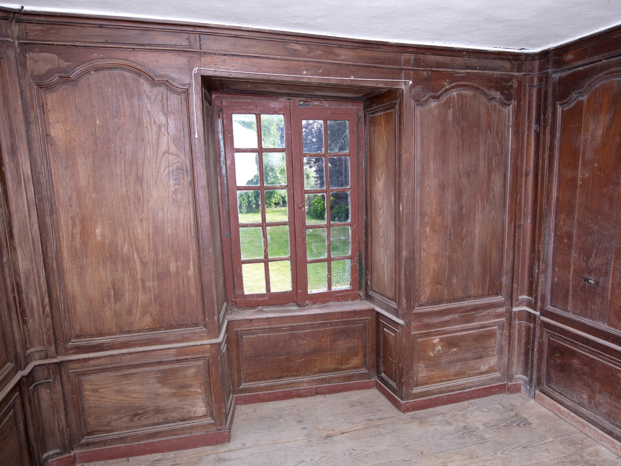 Tréguier, 20 et 22 rue Colvestre : pavillon de jardin ou "gloriette", vue intérieure, pièce avec cheminée et boiseriesImmatriculation