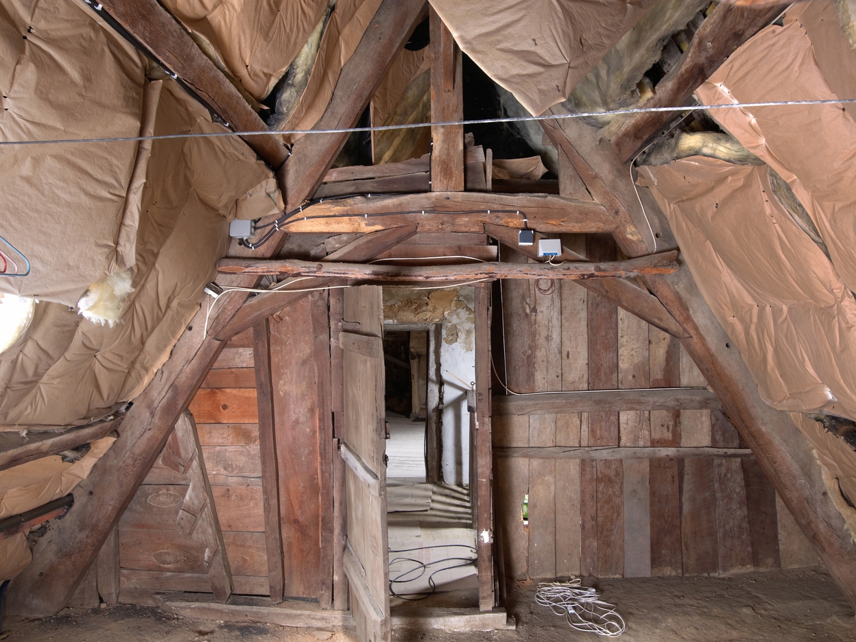 Combles. Partie Ouest. Détail d'une ferme à poinçon court et entrait retroussé contreventée par des jambettesImmatriculation