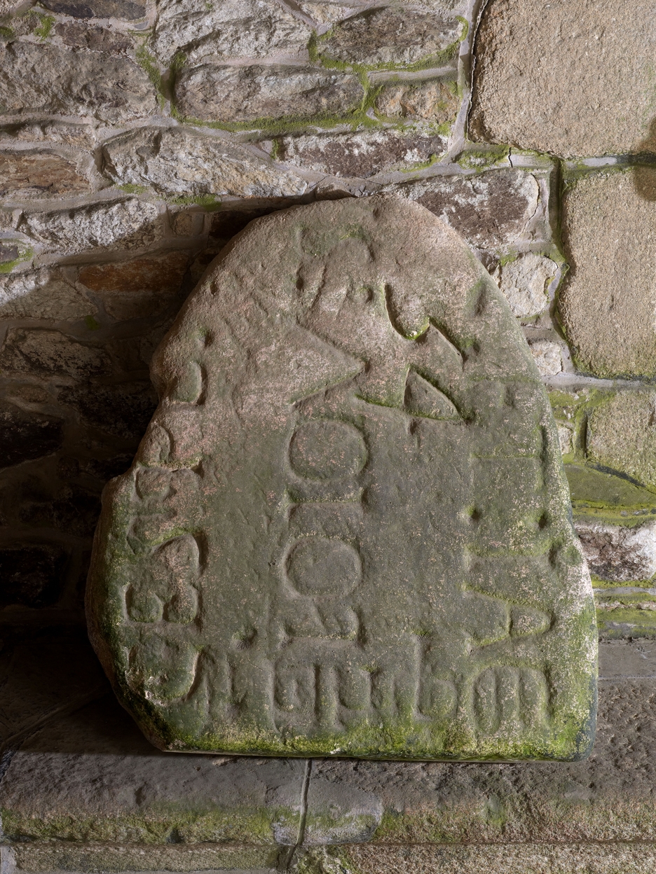 Tréguier : cloître de la cathédrale, galerie ouest, fragment de pierre tombaleImmatriculation