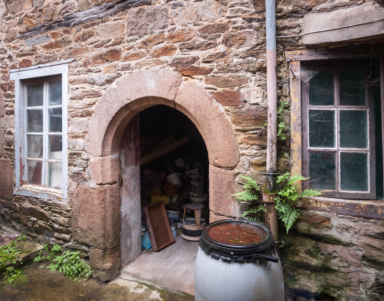 Tréguier, 15 rue Colvestre : maison à pan de bois rouge, aile sud sur cour, porte en arc plein cintre (2e moitié 16e siècle)Immatriculation