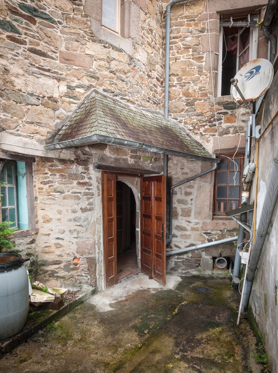 Tréguier, 15 rue Colvestre : maison à pan de bois rouge, élévation sur cour, tour d'escalier, porte en arc plein cintreImmatriculation