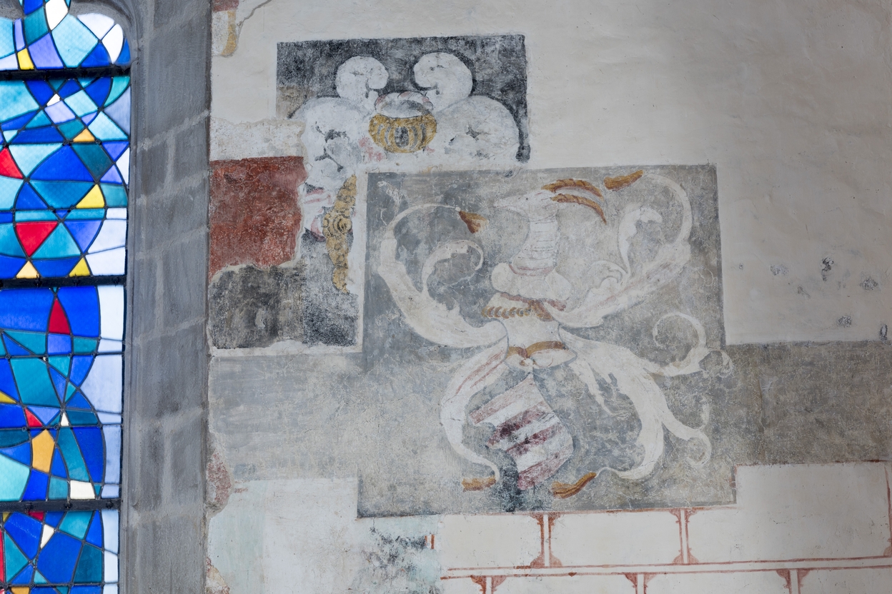 Vue intérieure, chevet, décor peint, litres seigneuriales, blason des QuédillacImmatriculation