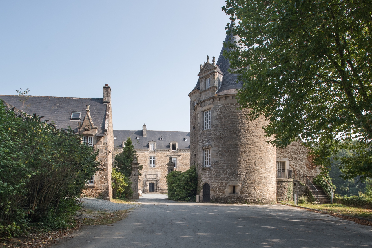 L'entrée, vue générale. La tour dite "tour d'amour", les communs, et en fond de cour le logis seigneurialImmatriculation