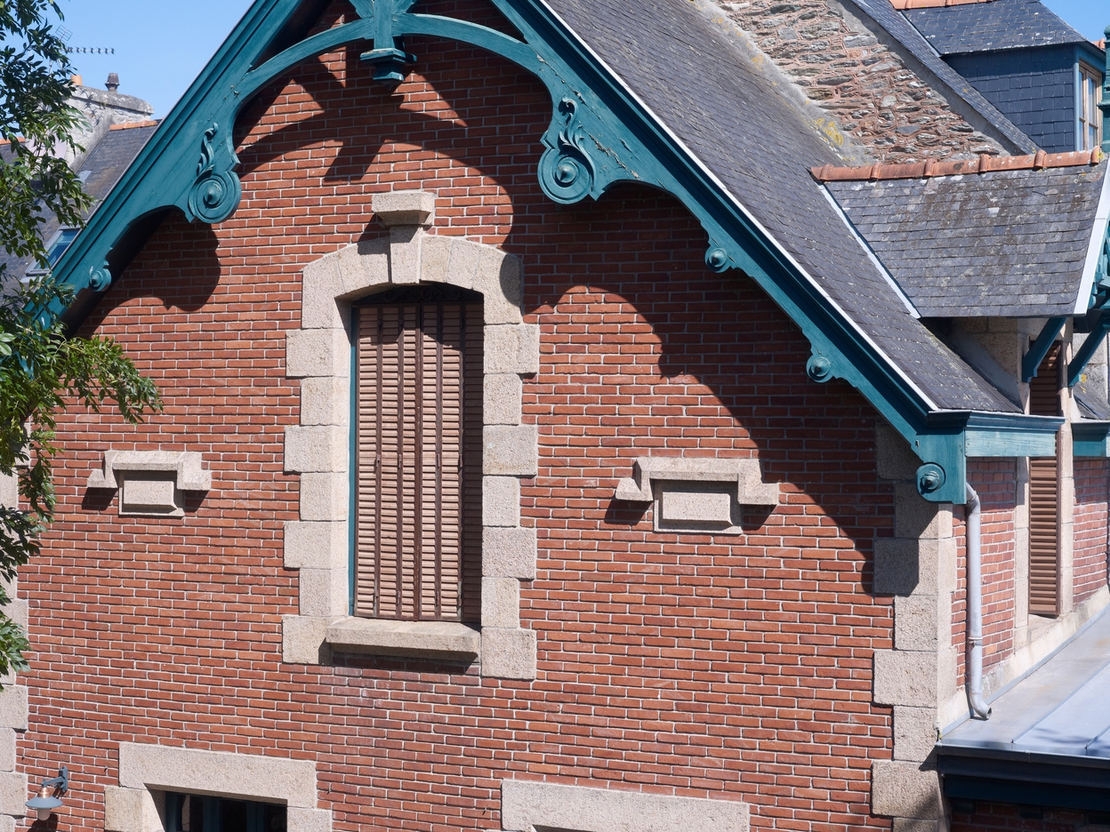 Extension de 1905. Détail du pignon sud avec son toit débordant et ses rives en bois sculptéImmatriculation