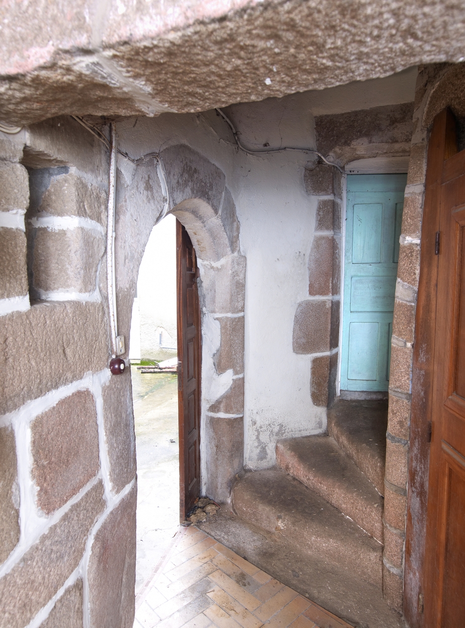 Tréguier, 15 rue Colvestre : maison à pan de bois rouge, tour d'escalier, porte en arc plein cintre donnant sur la cour et départ de l'escalier en visImmatriculation