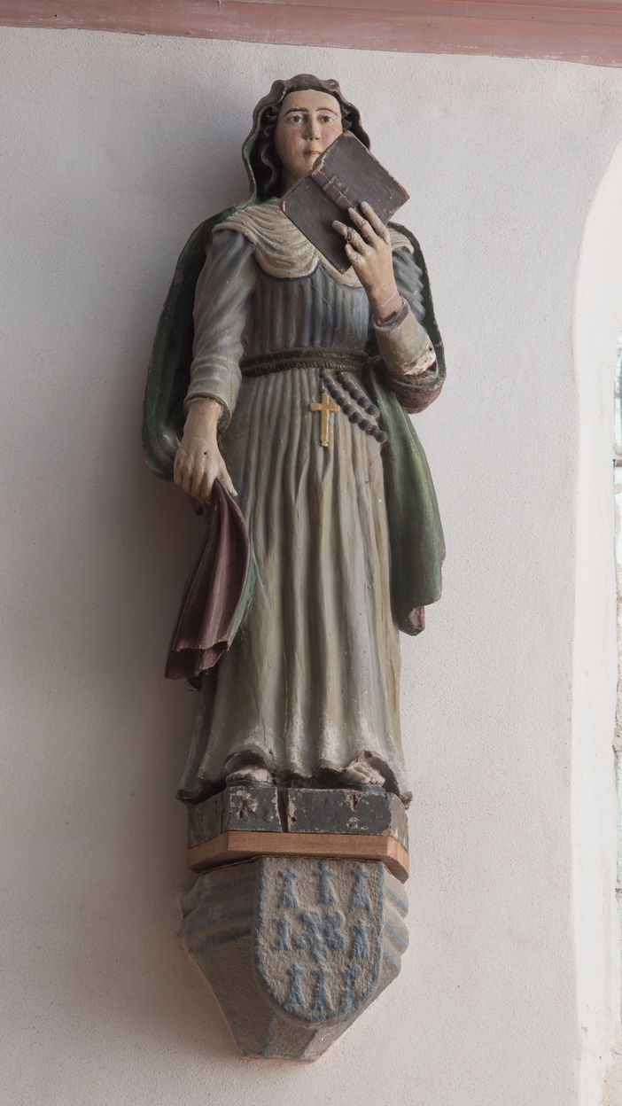 Choeur de l'église. Statue de sainte Brigitte en bois polychrome,18e siècle. La console porte les armes des Lagadec (seigneurs de La Salle)Immatriculation
