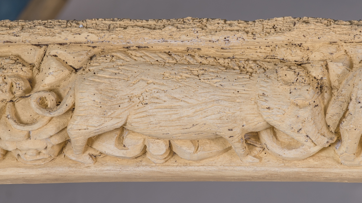 Entrait sculpté : sanglier.Immatriculation