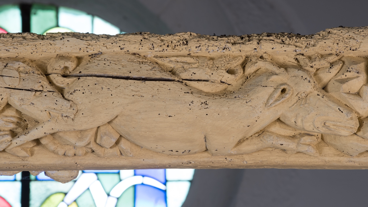 Entrait sculpté : cerf attaqué par un chien.Immatriculation