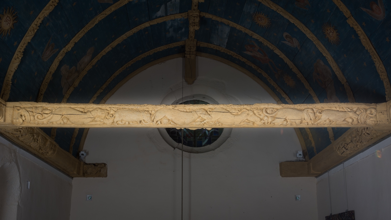 Face est de l'entrait de la nef : scène de chasse.Immatriculation
