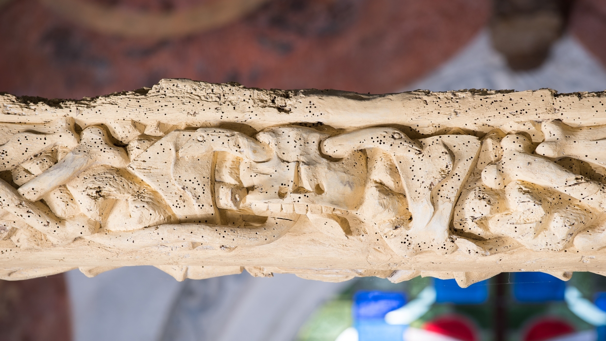 Face ouest de l'entrait du choeur : détail crâne aux serpents.Immatriculation