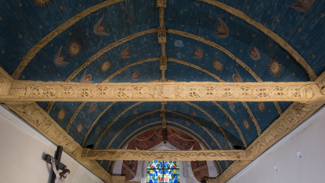 Vue genérale d'ouest en est de la charpente lambrissée .Immatriculation