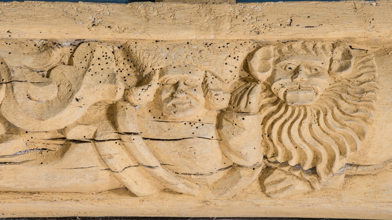 Détail sablières : personnage et lion.Immatriculation