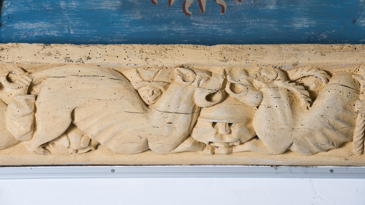 Sablière nord : dragons affrontés, têtes.Immatriculation