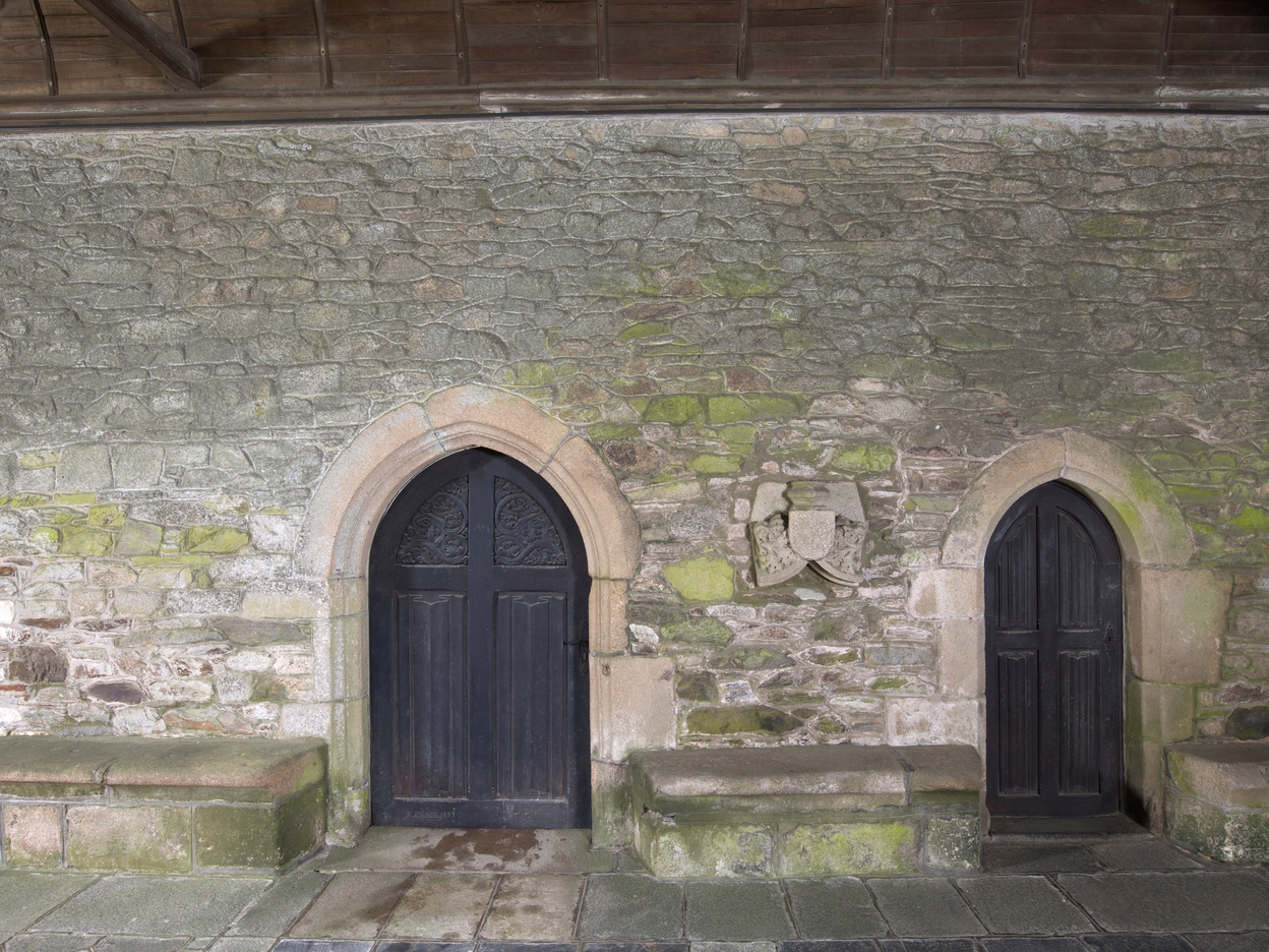 Tréguier : cloître de la cathédrale, intérieur de la galerie nord, portes donnant sur la Venelle du cloître (celle de droite correspond aux latrines du cloître). Ces portes sont l'œuvre de l’ébéniste André Le Picard (1911-1989)Immatriculation