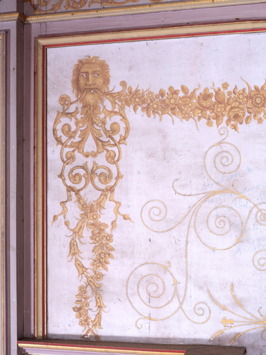 Nef des fidèles. Détail d'un panneau de mur à décor peint et doré à l'or : tête de sauvage, guirlandes de fleurs et volutesImmatriculation