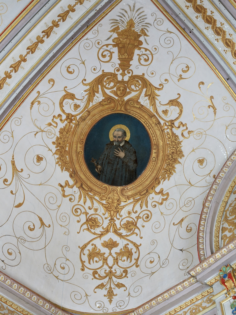 Nef des fidèles. Voûte. Détail d'un médaillon : saint Vincent de Paul, daté 1871, signé J.HERLIDOImmatriculation