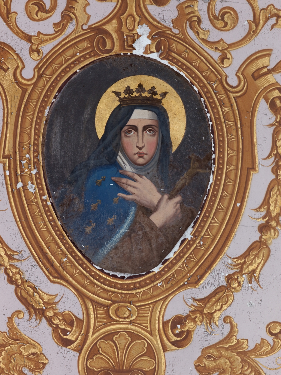 Nef des fidèles. Voûte. Détail d'un médaillon : sainte Françoise d'Amboise, daté 1871, signé J.HERLIDOImmatriculation