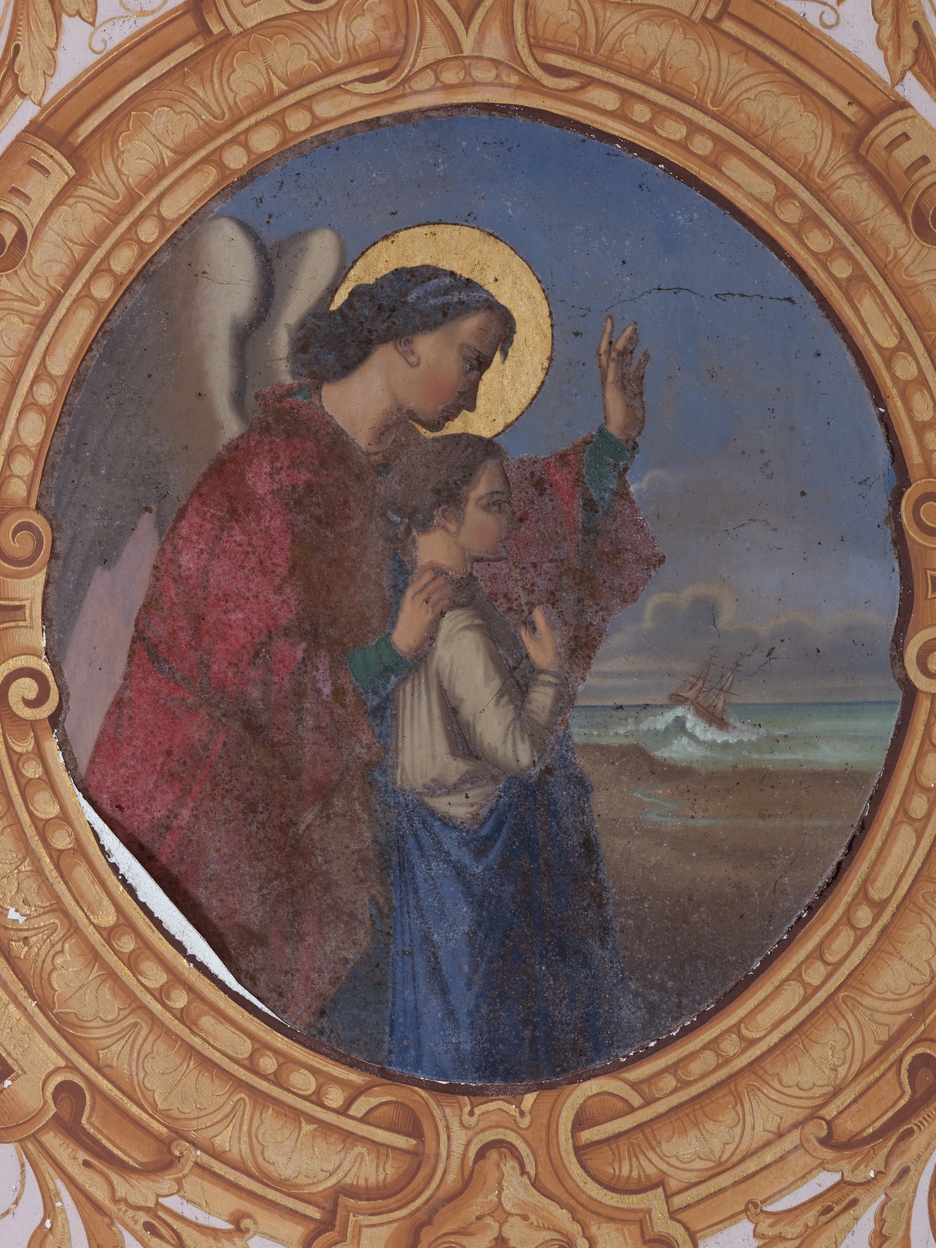 Nef des fidèles. Voûte. Détail d'un médaillon : L'Ange Raphaël, daté 1871, signé J.HERLIDOImmatriculation