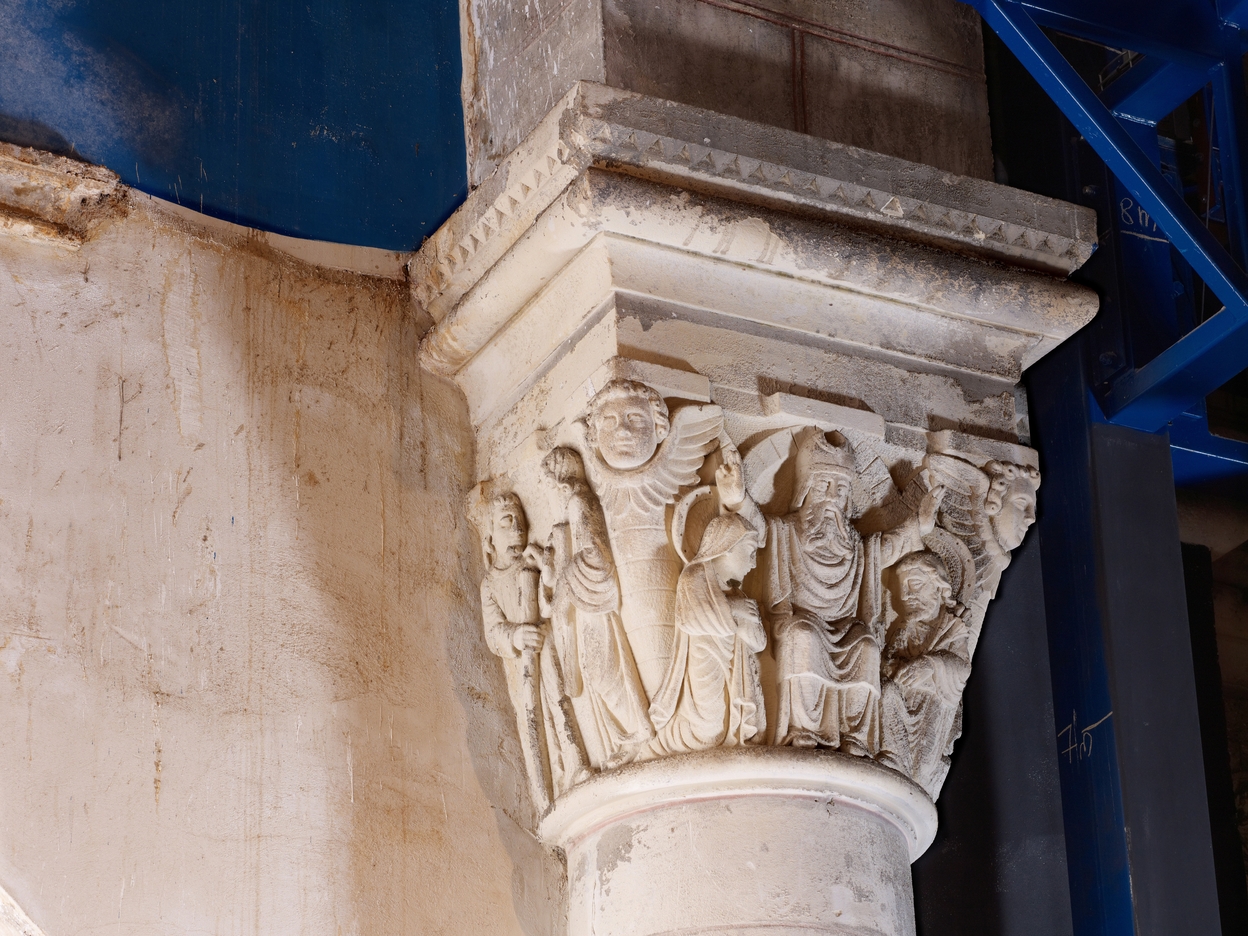 Tréguier, place de la République : chapelle du Petit Séminaire aujourd'hui Théâtre de l'Arche, détail de l'un des chapiteaux ornés de bas-reliefImmatriculation