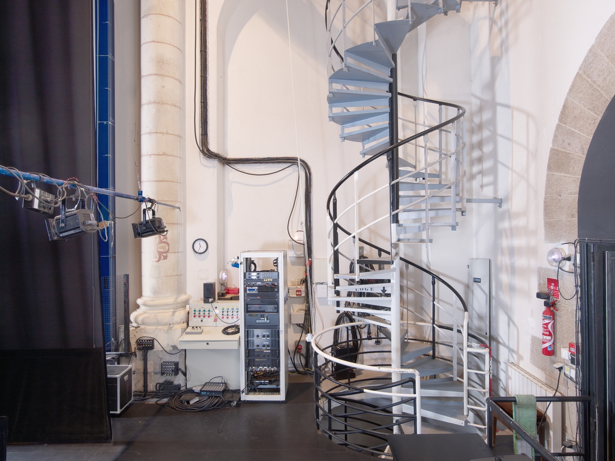 Tréguier, place de la République : chapelle du Petit Séminaire aujourd'hui Théâtre de l'Arche, arrière-scène, accès aux loges via un escalier hélicoïdal (aménagées en sous-sol)Immatriculation