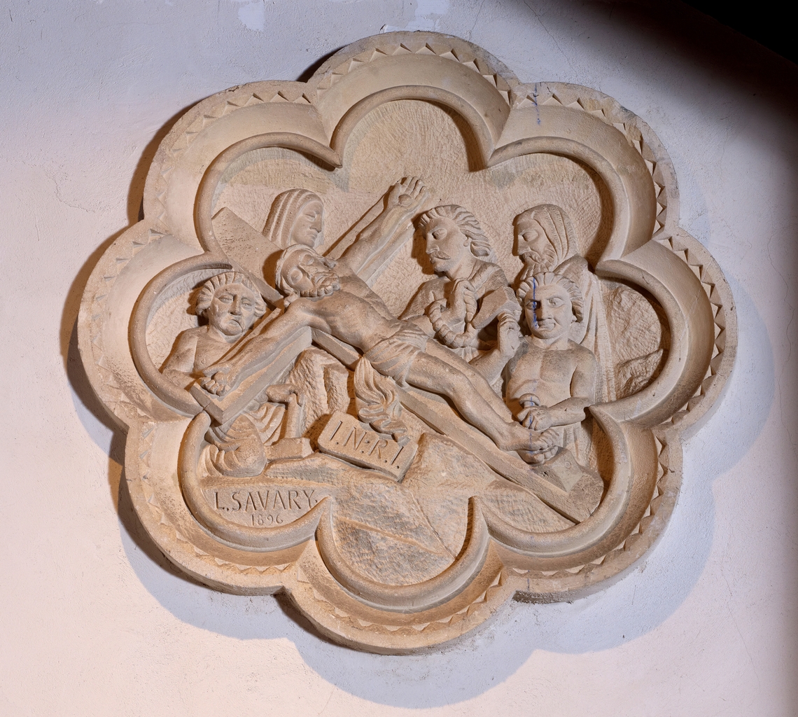 Tréguier, place de la République : chapelle du Petit Séminaire aujourd'hui Théâtre de l'Arche, chemin de croix de Louis Savary daté 1896, Jésus est cloué sur la croixImmatriculation