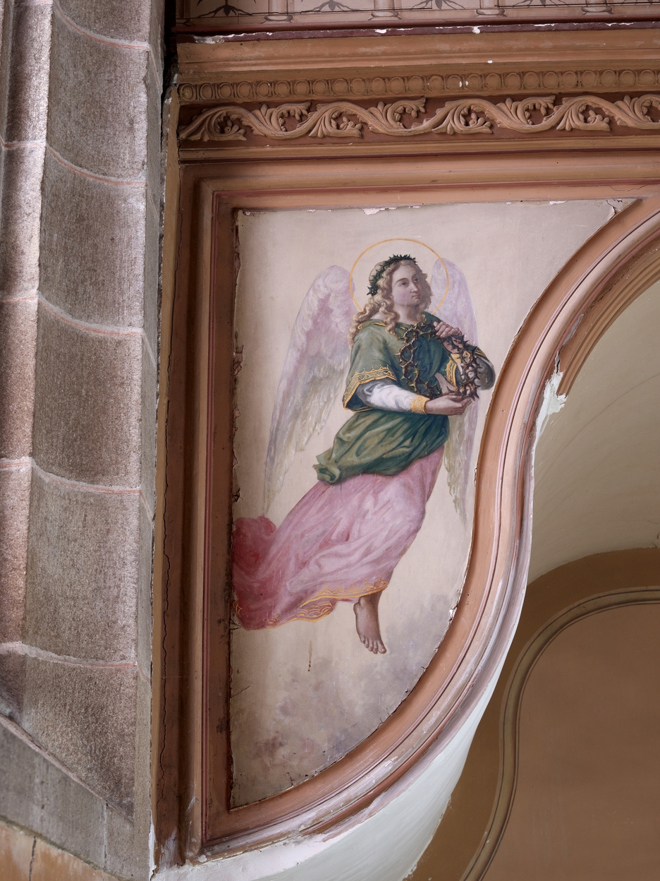 Chapelle. Avant-choeur des soeurs. Tribune des malades. Détail d'un écoinçon : ange portant la Sainte CouronneImmatriculation
