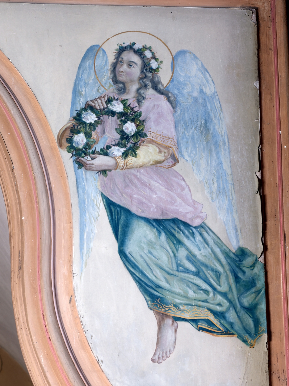 Chapelle. Avant-choeur des soeurs. Tribune des malades. Détail d'un écoinçon : ange portant la Sainte Couronne fleurieImmatriculation