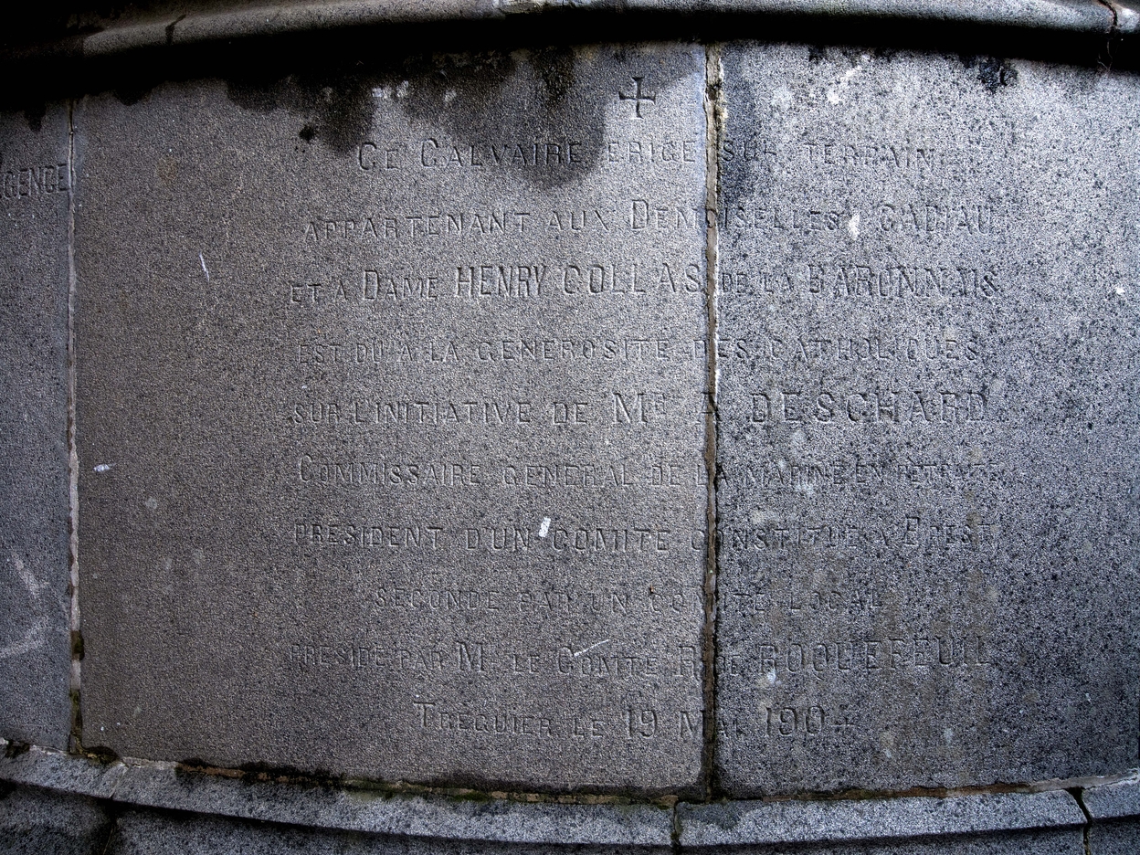 Tréguier, rue Marcellin Berthelot - Parc de la Baronnais : calvaire de Réparation, revers. On peut lire : "Ce calvaire érigé sur terrain / appartenant aux demoiselles Cadiau / et à dame Henry Collas de La Baronnais / est dû à la générosité des catholiques / sur l'initiative Mr A Deschard / commissaire général de la Marine en retraite / président d'un comité constitué à Brest / présidé par M Le Comte R de Roquefeuil / Tréguier le 19 mai 1904"Immatriculation