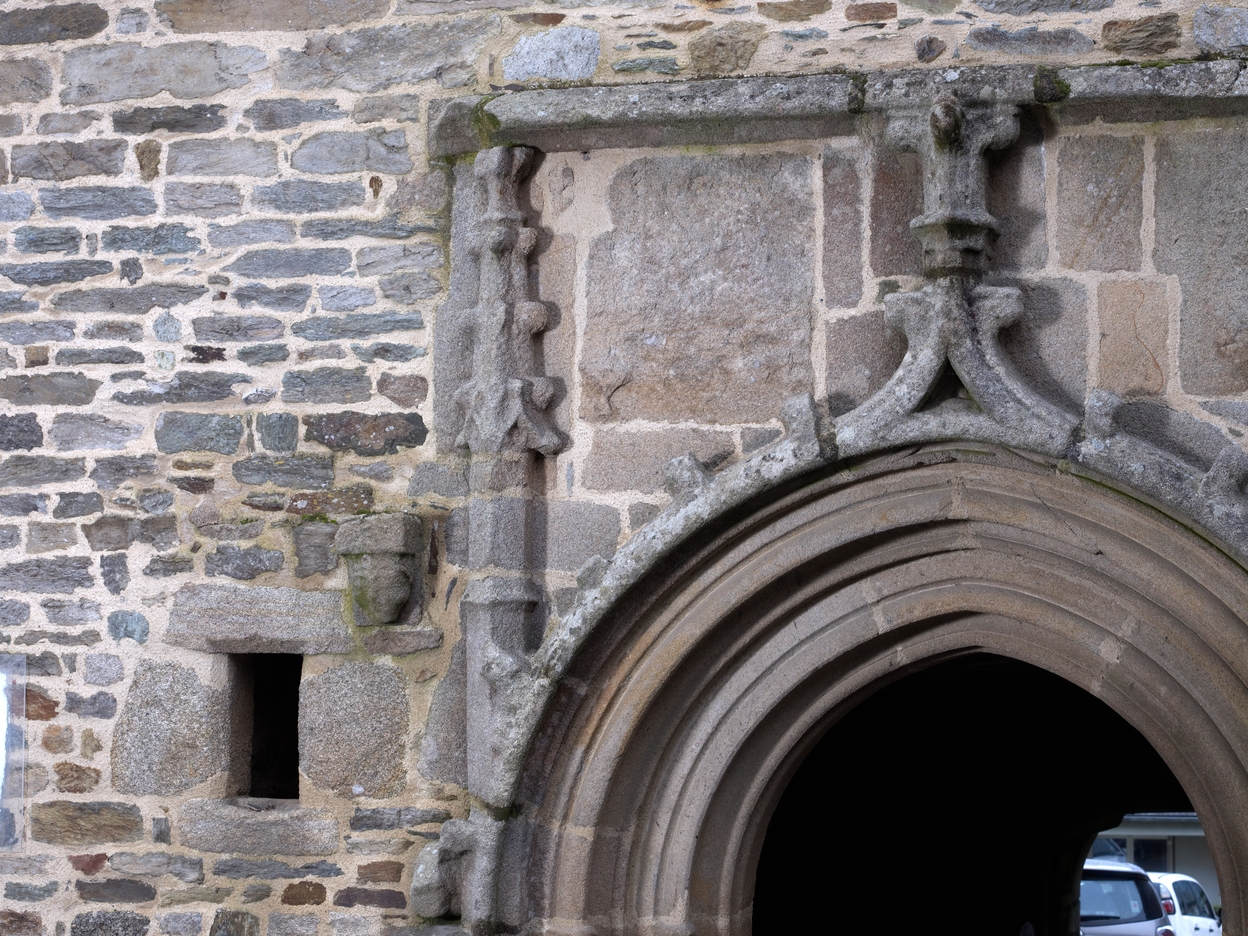 Corps de logis. Elévation sud sur rue. Détail du portail gothique avec emplacement d'armoiries et jour d'éclairage du vestibuleImmatriculation