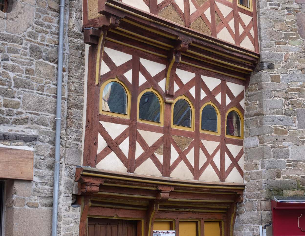 Façade sur rue. Détail du pan de bois du premier étageImmatriculation