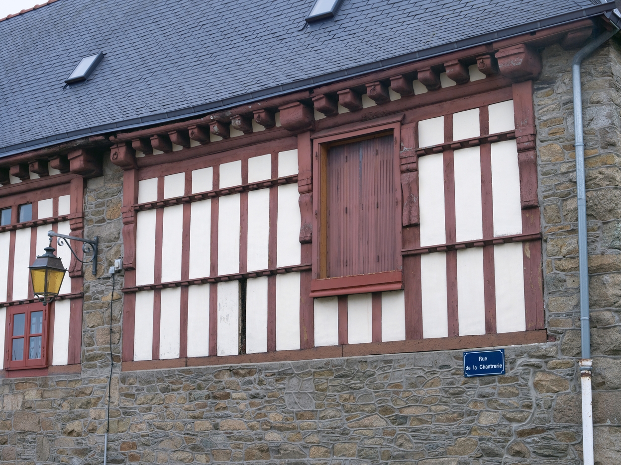 Façade nord. Détail du pan de bois avec bandeaux filants à modillons correspondant à l'appui et à la division de la baie dans ses dimensions d'origineImmatriculation