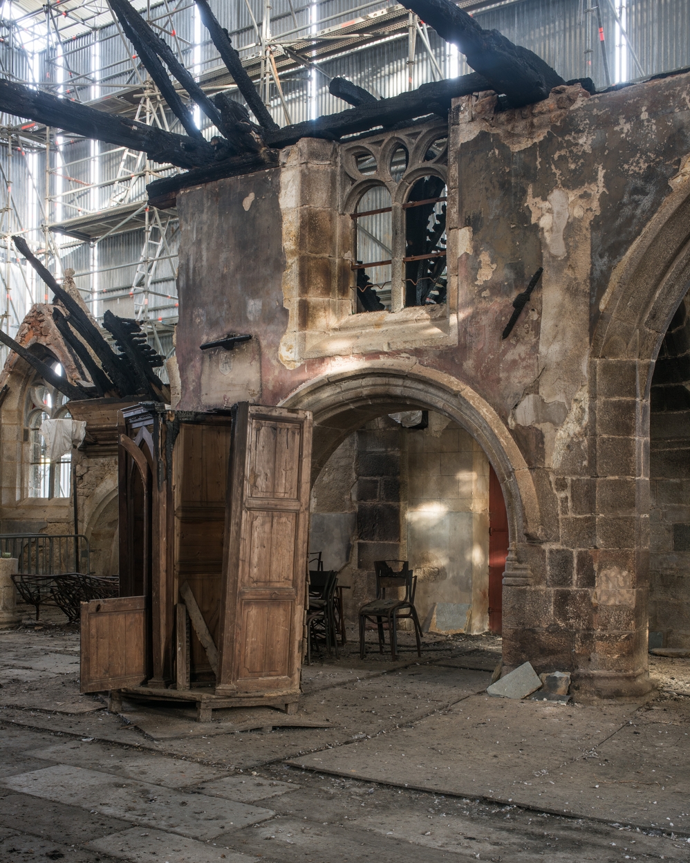 Trémel, le bourg : église paroissiale Notre-Dame, vue intérieure (après l'incendie du 21 juin 2016)Immatriculation