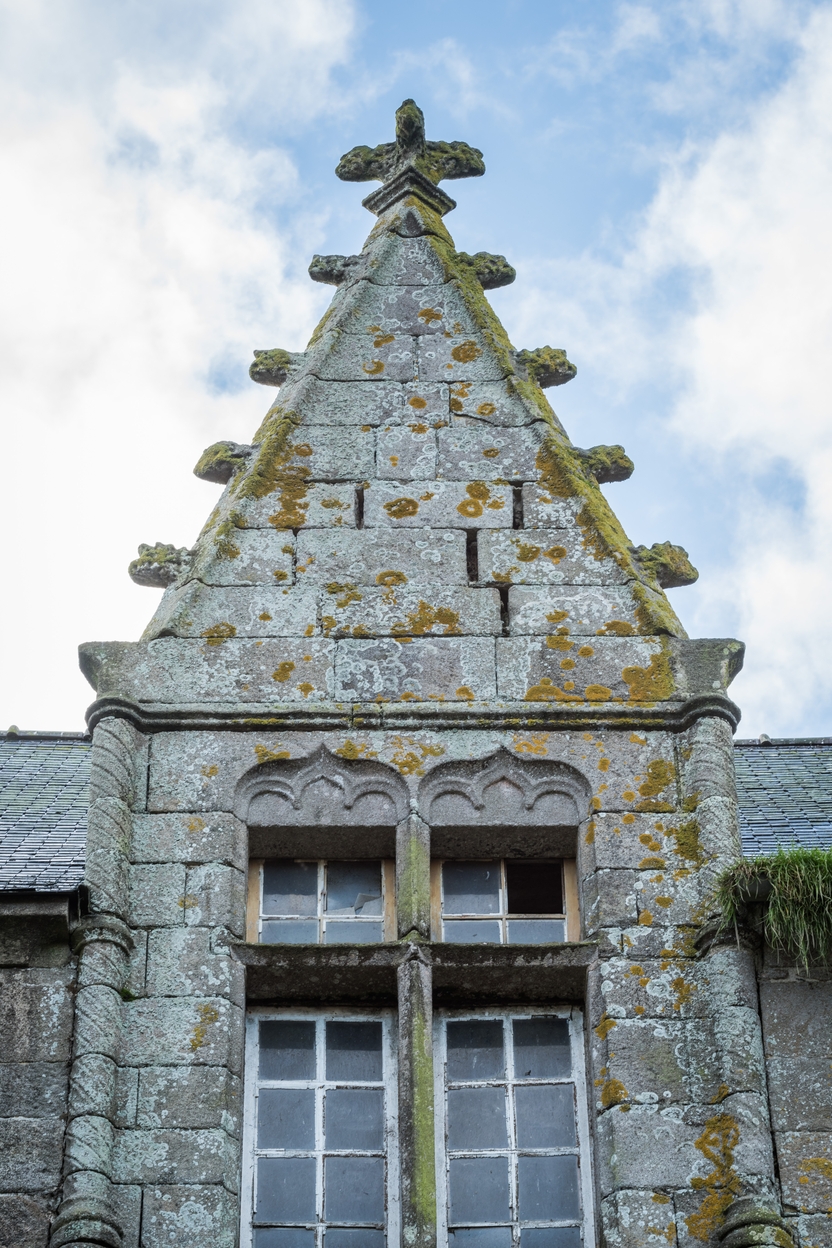 Trémel : manoir haut de Kermerzit, élévation antérieure orientée vers le nord, détail de l'une des deux lucarnes des comblesImmatriculation