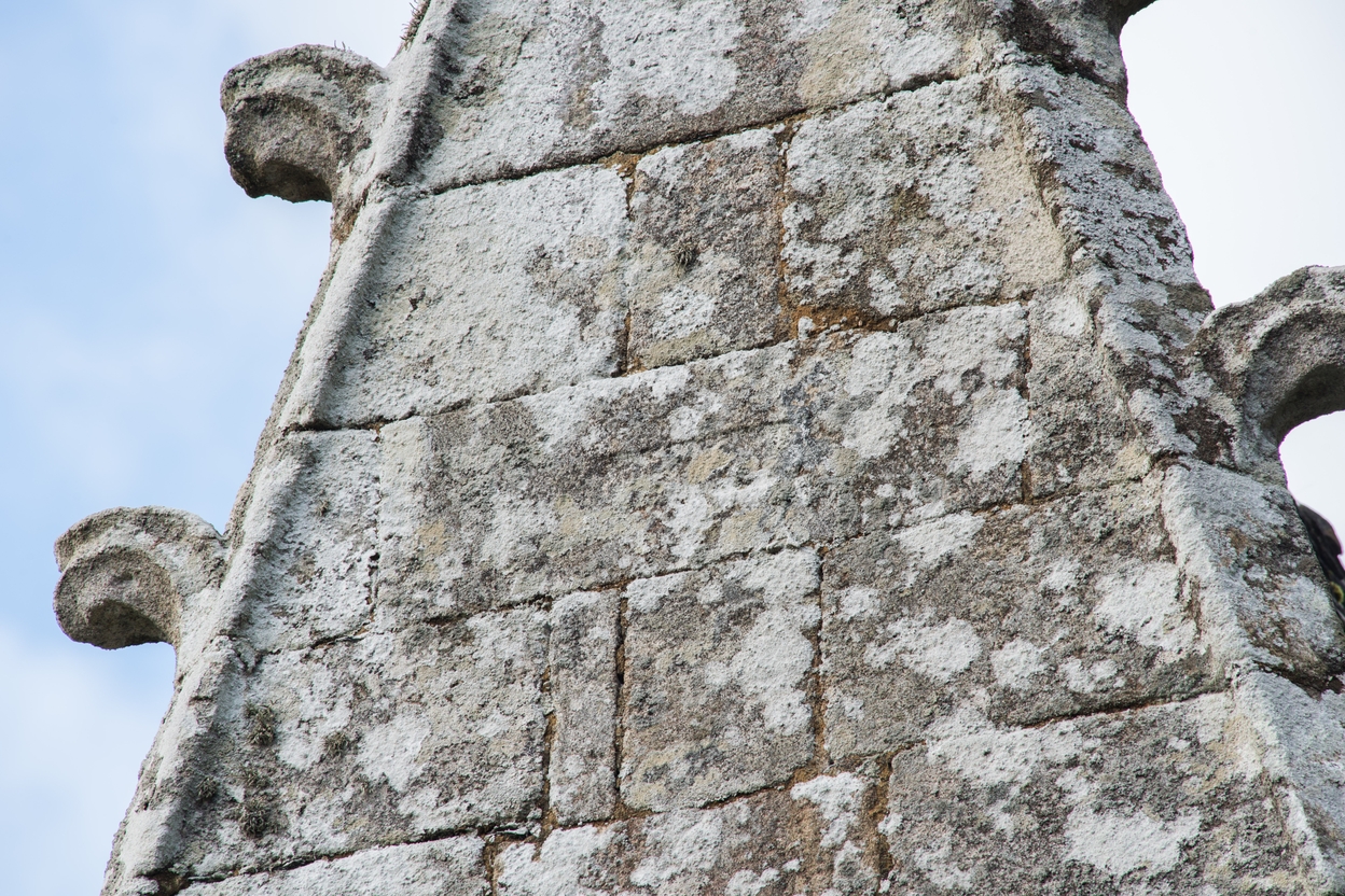 Plufur : chapelle Saint-Nicolas, détail du chevet polygonal, pignon élancé (fronton triangulaire ou gâble) ouvragé, millésime ?Immatriculation