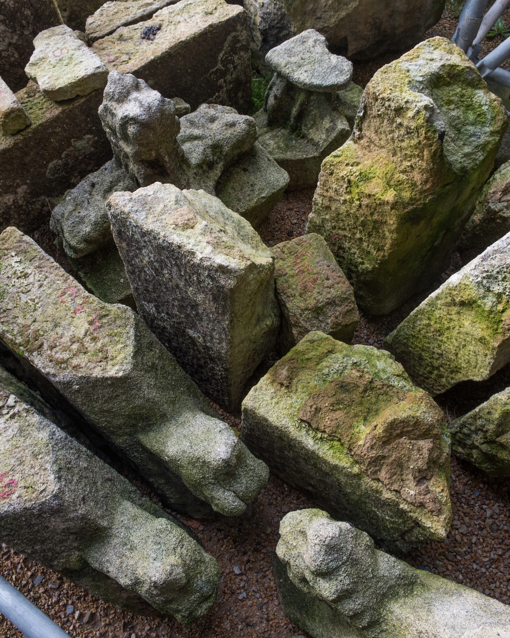 Trémel, le bourg : église paroissiale Notre-Dame, vue extérieure, détail du dépôt de pierre de taille (après l'incendie du 21 juin 2016)Immatriculation