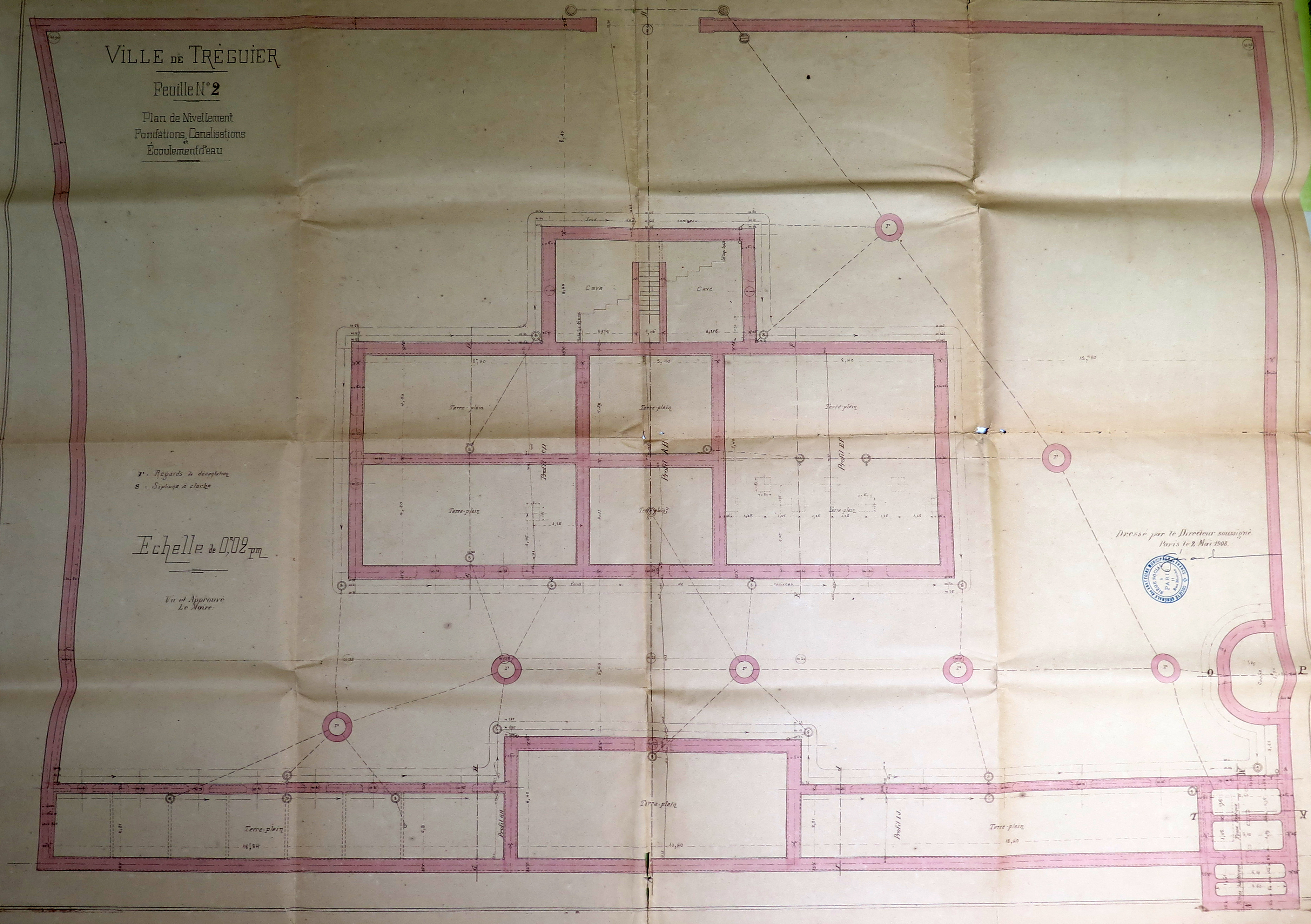 Tréguier, rue du Guindy : plan de nivellement, fondations, canalisations, écoulement d'eau de l'abattoir de la ville de Tréguier, 2 mai 1908 (Archives municipales de Tréguier, 1M9)Immatriculation